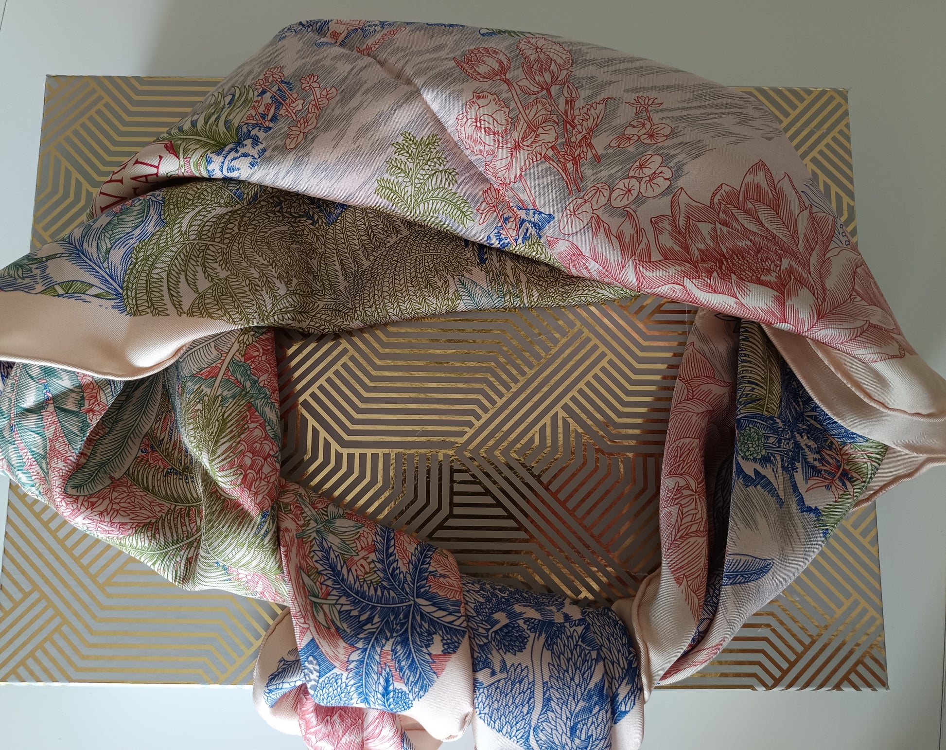 Paleta kolorystyczna to kojące pastele – rozmyte odcienie różu, błękitu, rozświetlone nutą pudrowej bieli. Wszystko skąpane w delikatnym blasku jedwabiu, który nadaje apaszce szlachetnego wyrazu i pięknego układania się wokół szyi.