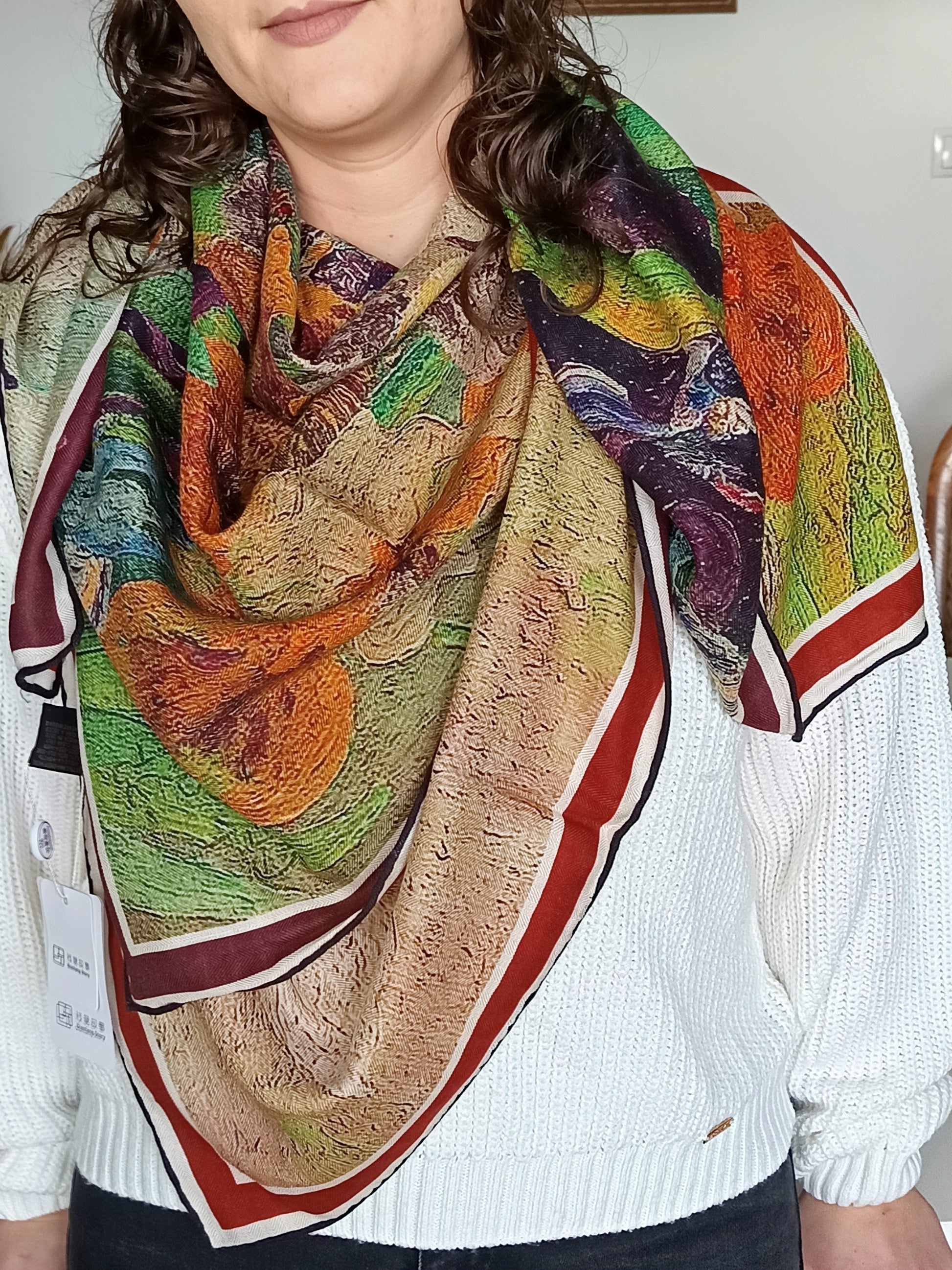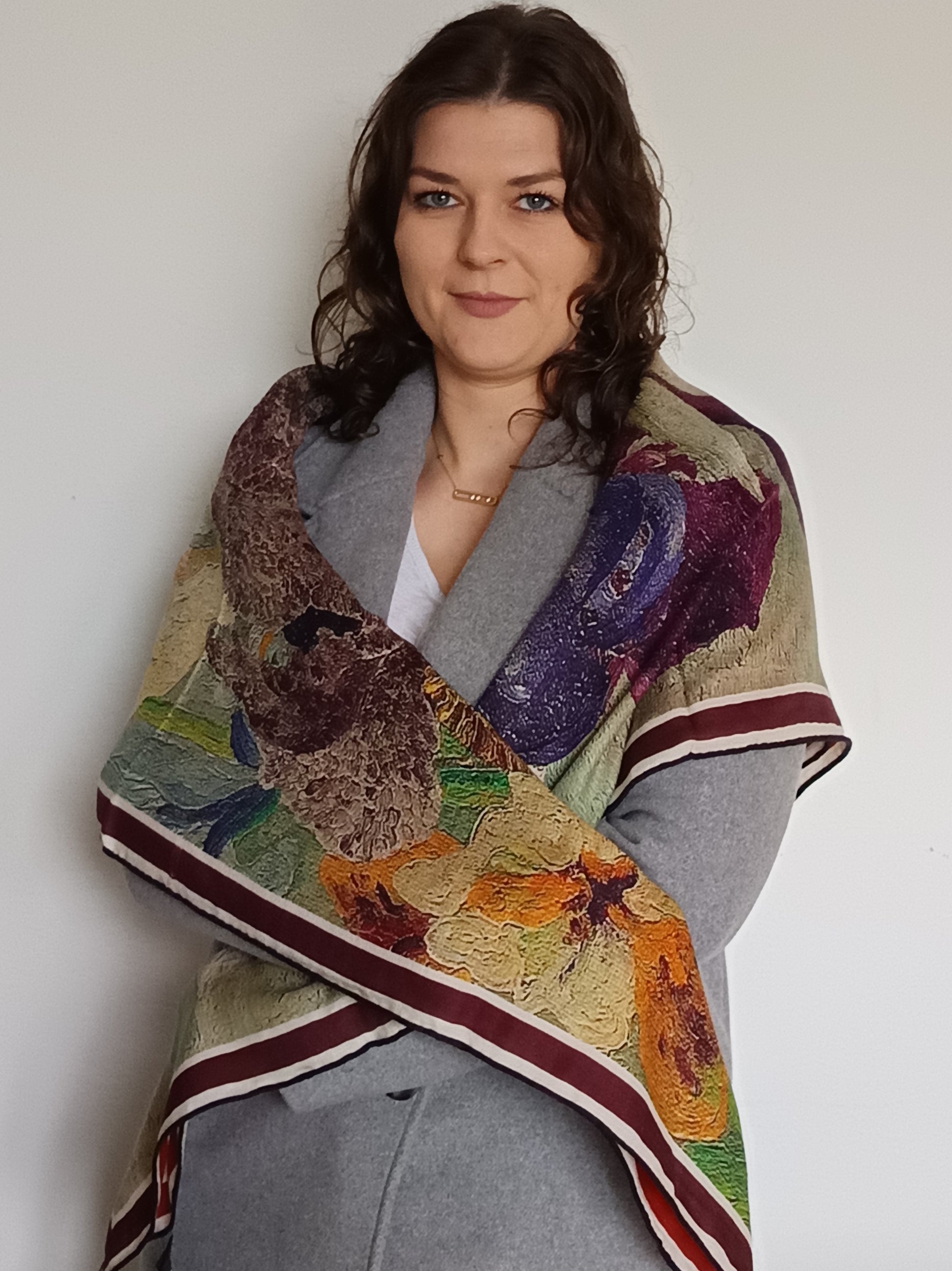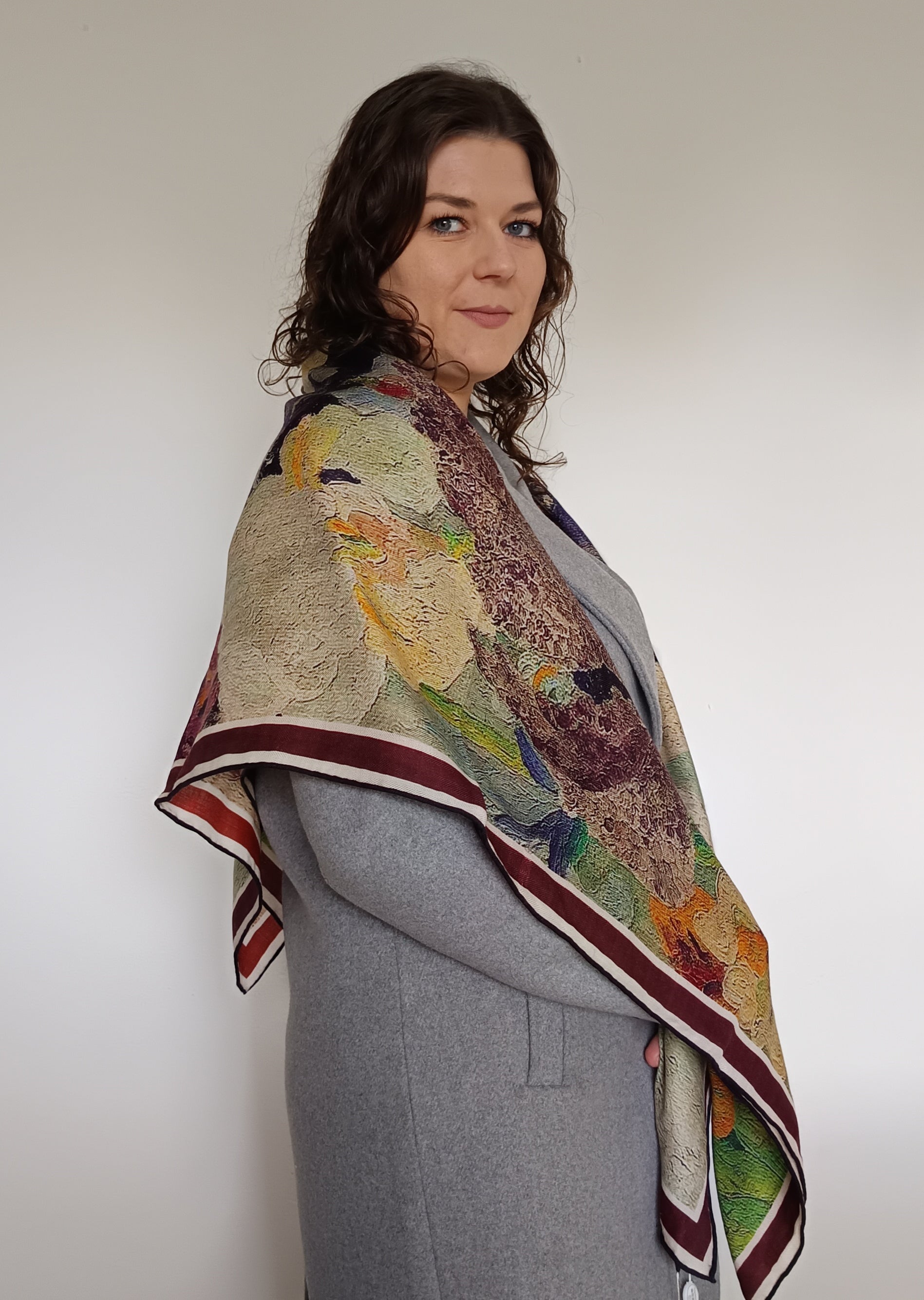 Wzór, który zachwyca: Na tym szalu kwiaty ożywają w pełni swojej urody. Każdy detal jest jak pociągnięcie pędzla malarza – intensywne kolory, które przyciągają spojrzenia, i delikatne, ale wyraziste kwiaty, niczym obrazy malowane olejem. To esencja kobiecości w najpiękniejszej, artystycznej odsłonie.