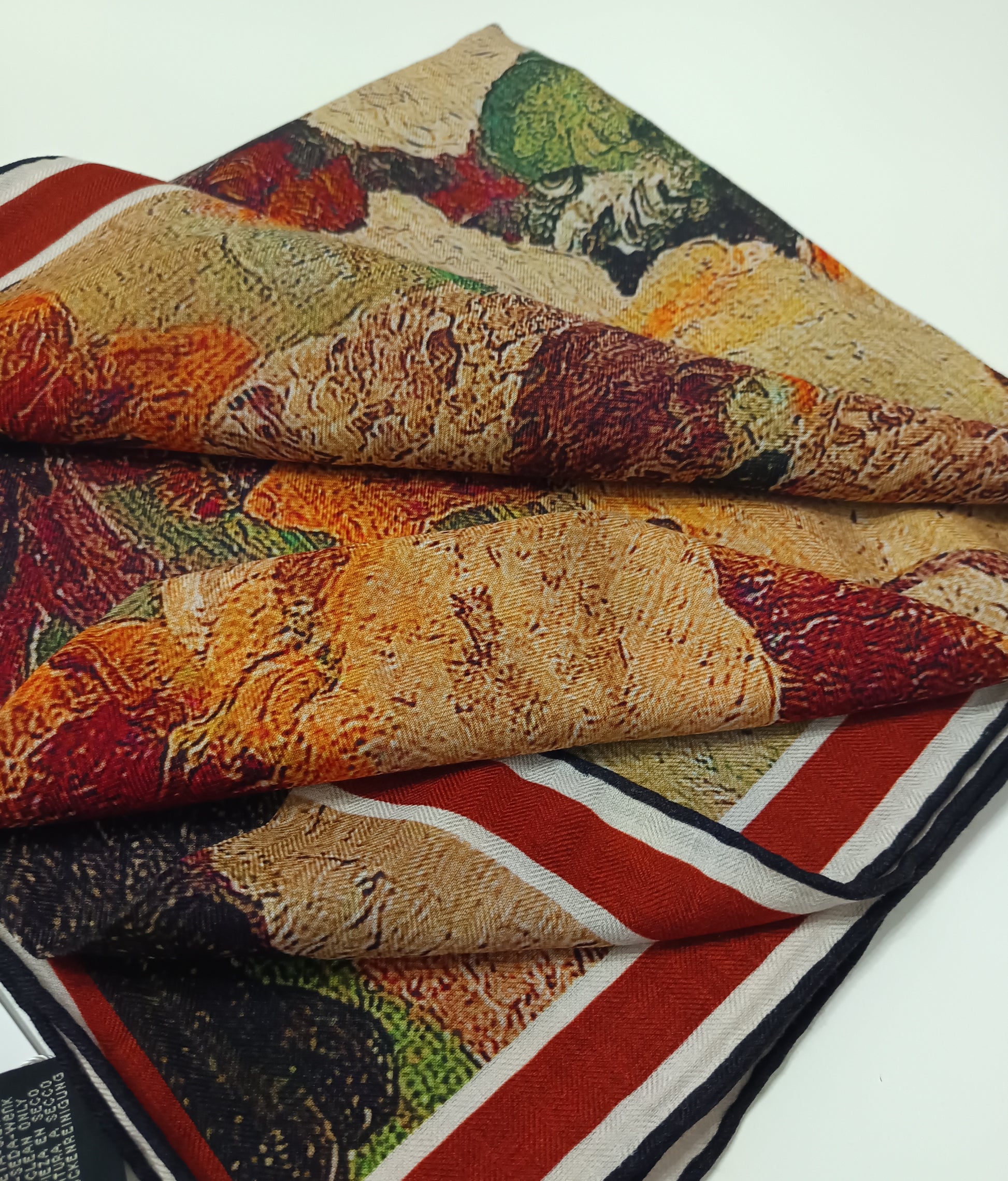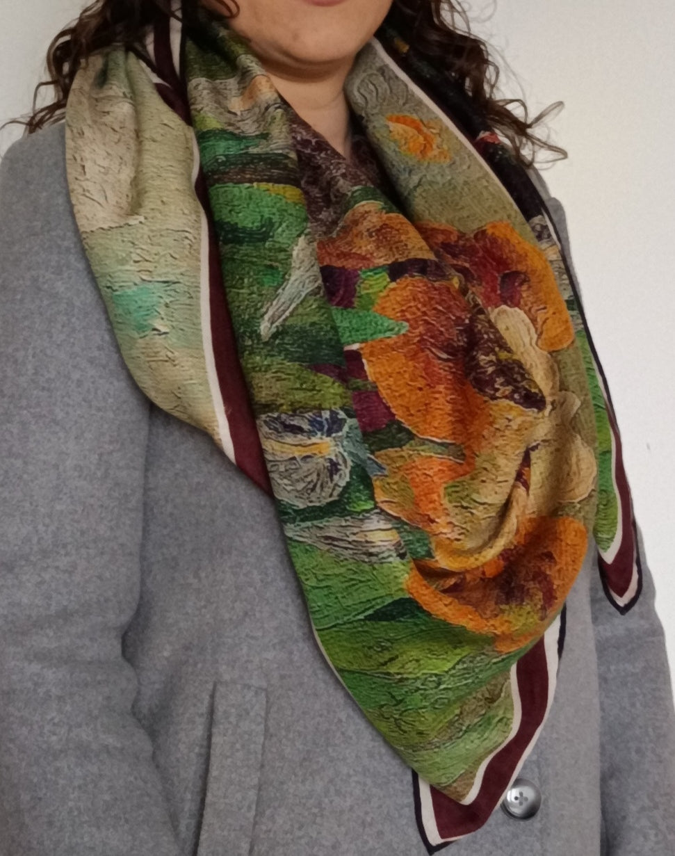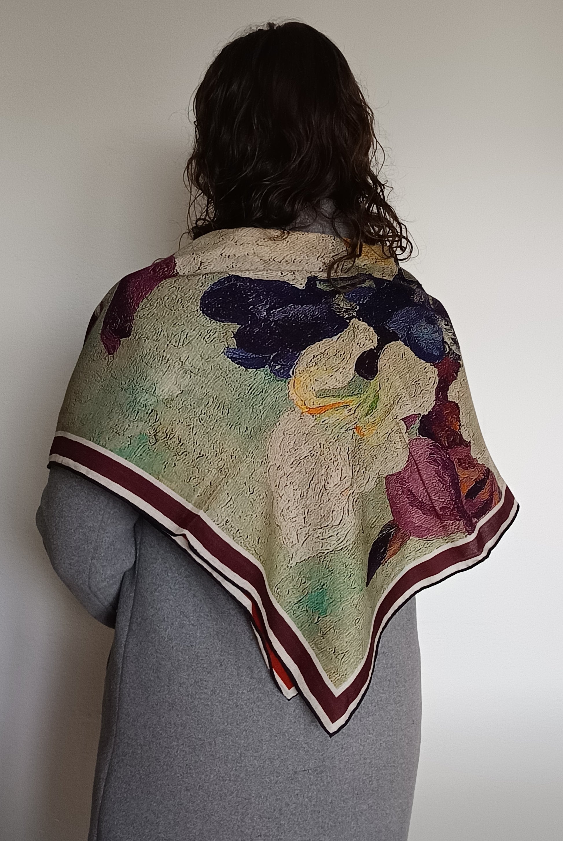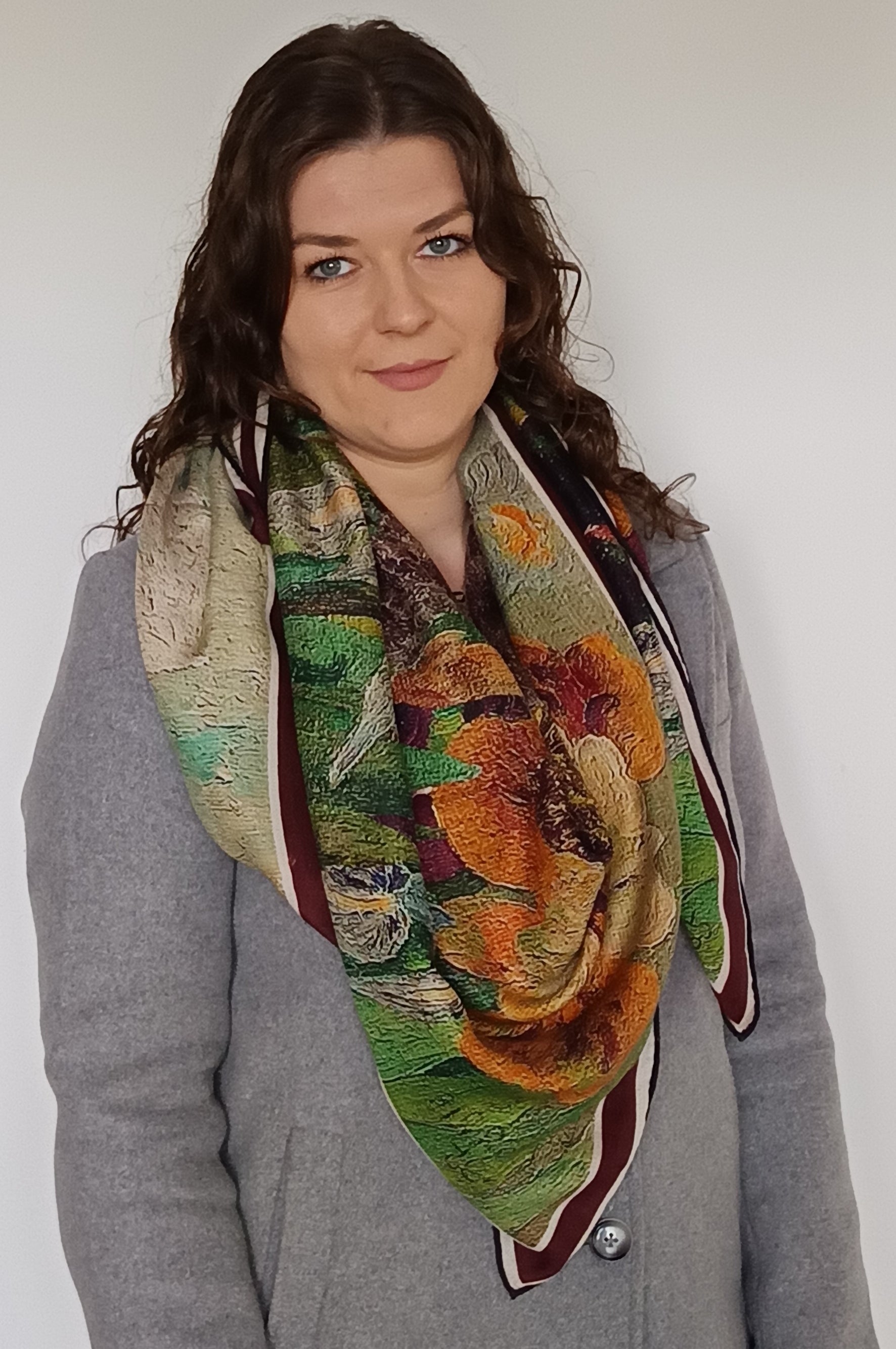 Wzór, który zachwyca: Na tym szalu kwiaty ożywają w pełni swojej urody. Każdy detal jest jak pociągnięcie pędzla malarza – intensywne kolory, które przyciągają spojrzenia, i delikatne, ale wyraziste kwiaty, niczym obrazy malowane olejem. To esencja kobiecości w najpiękniejszej, artystycznej odsłonie.