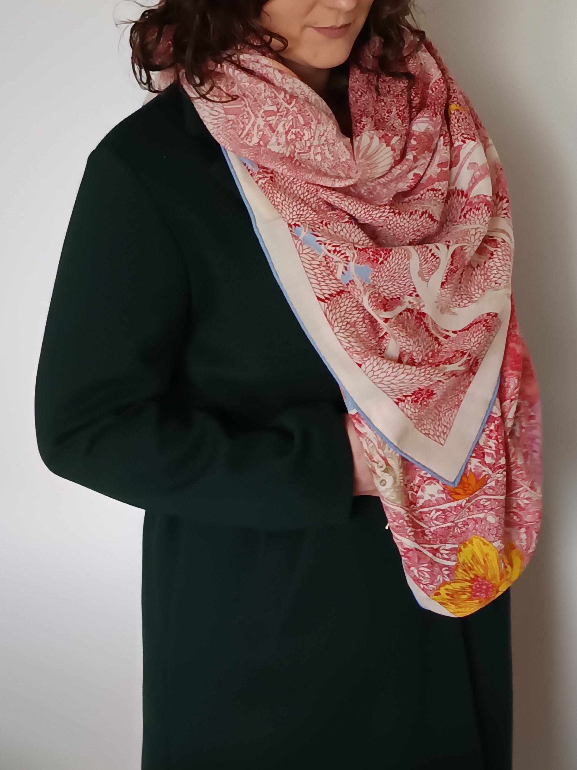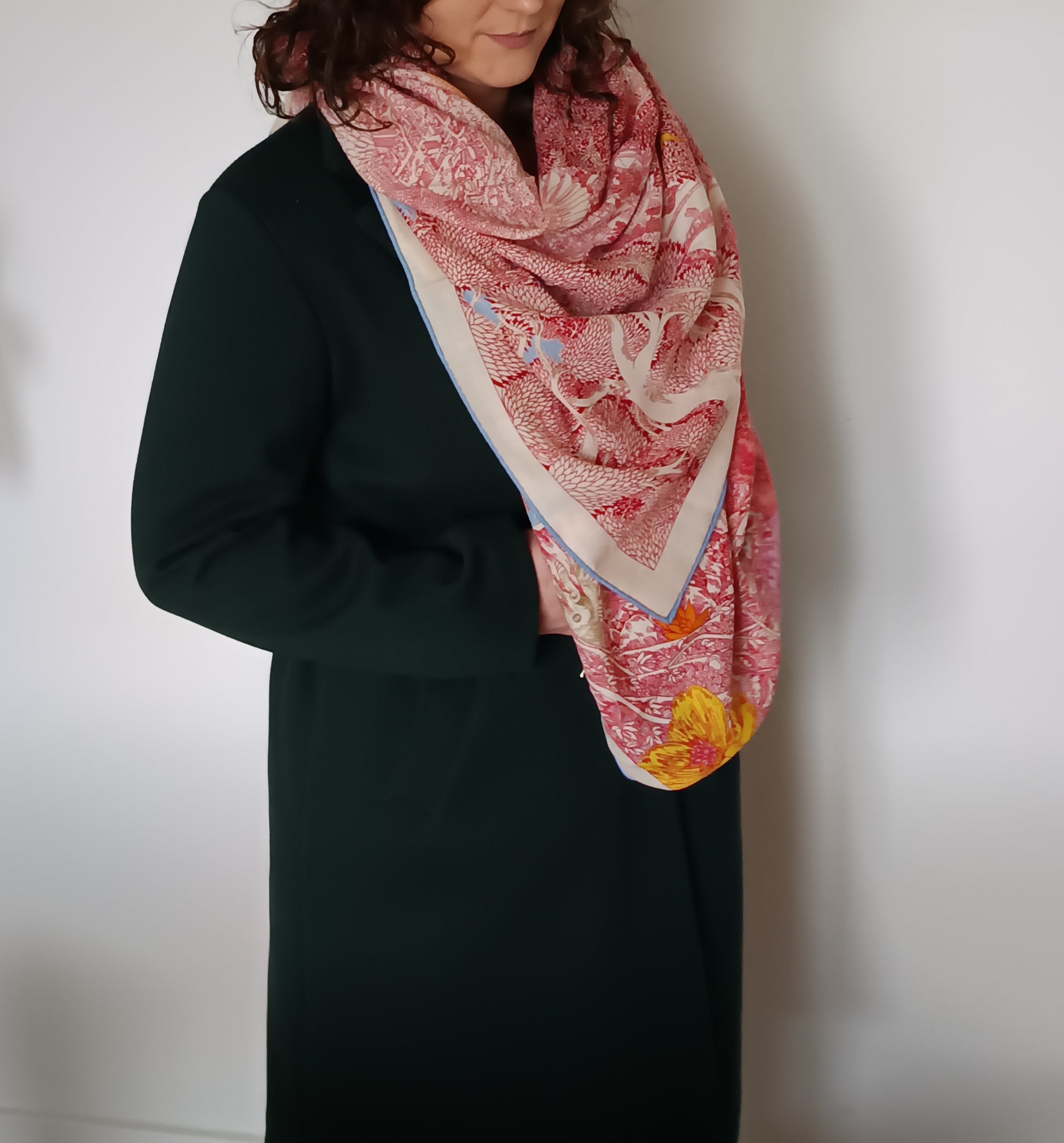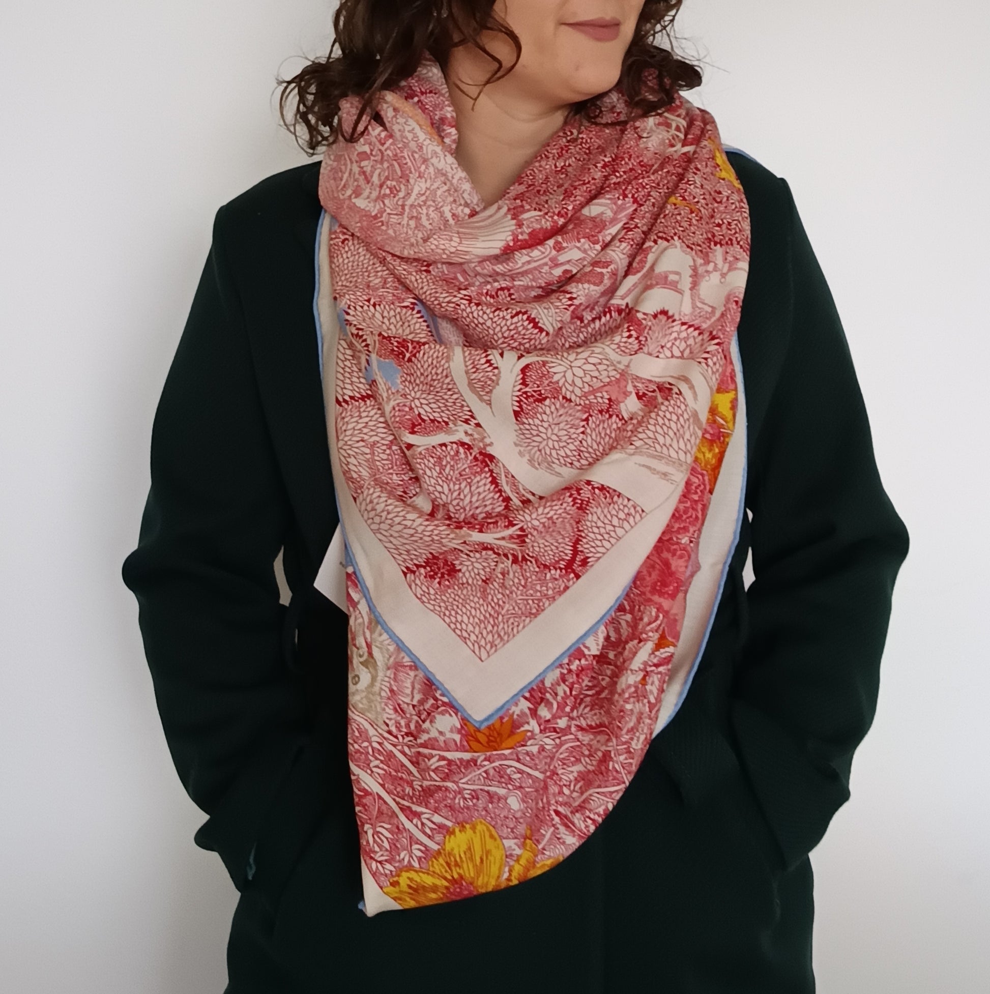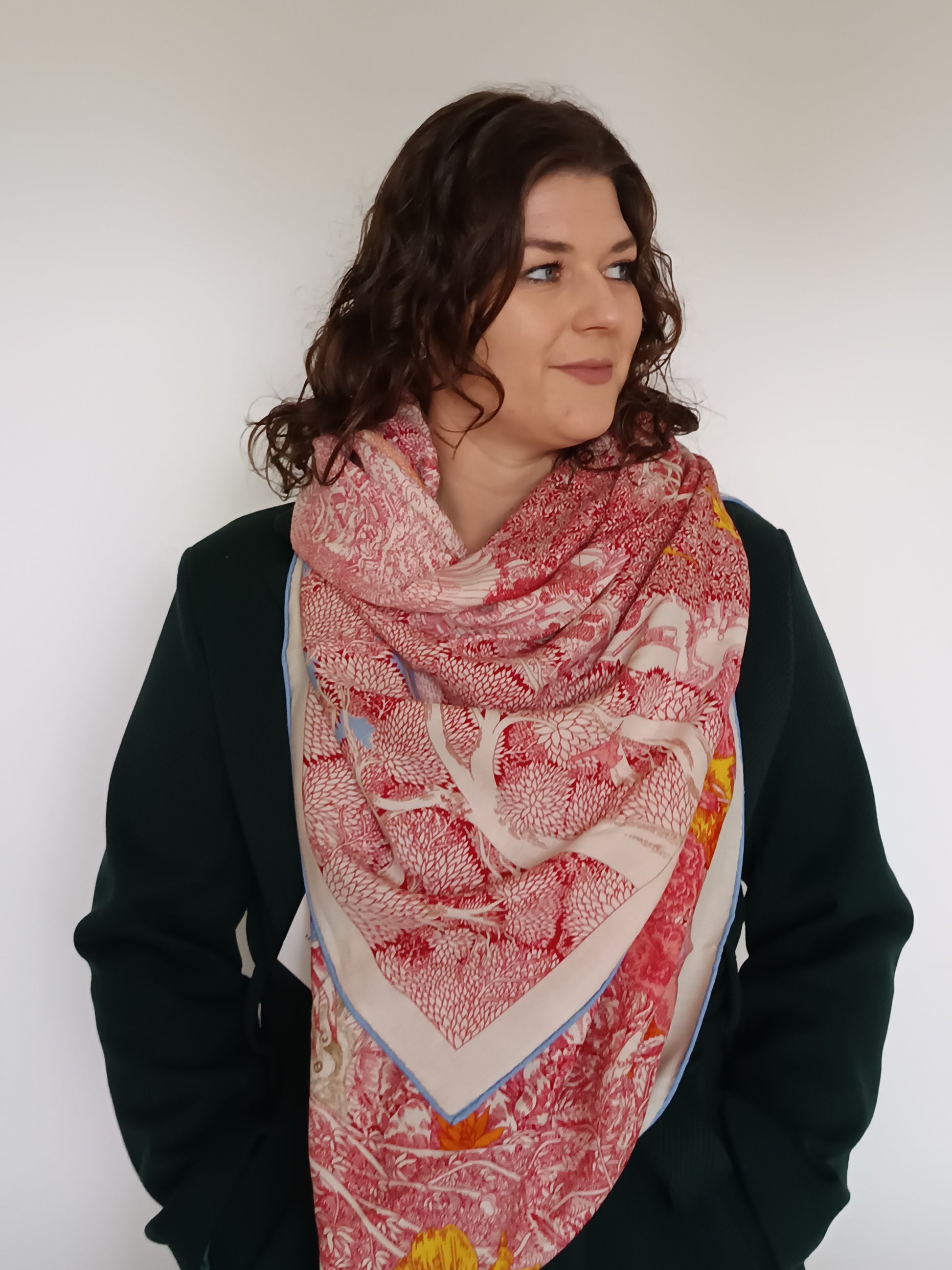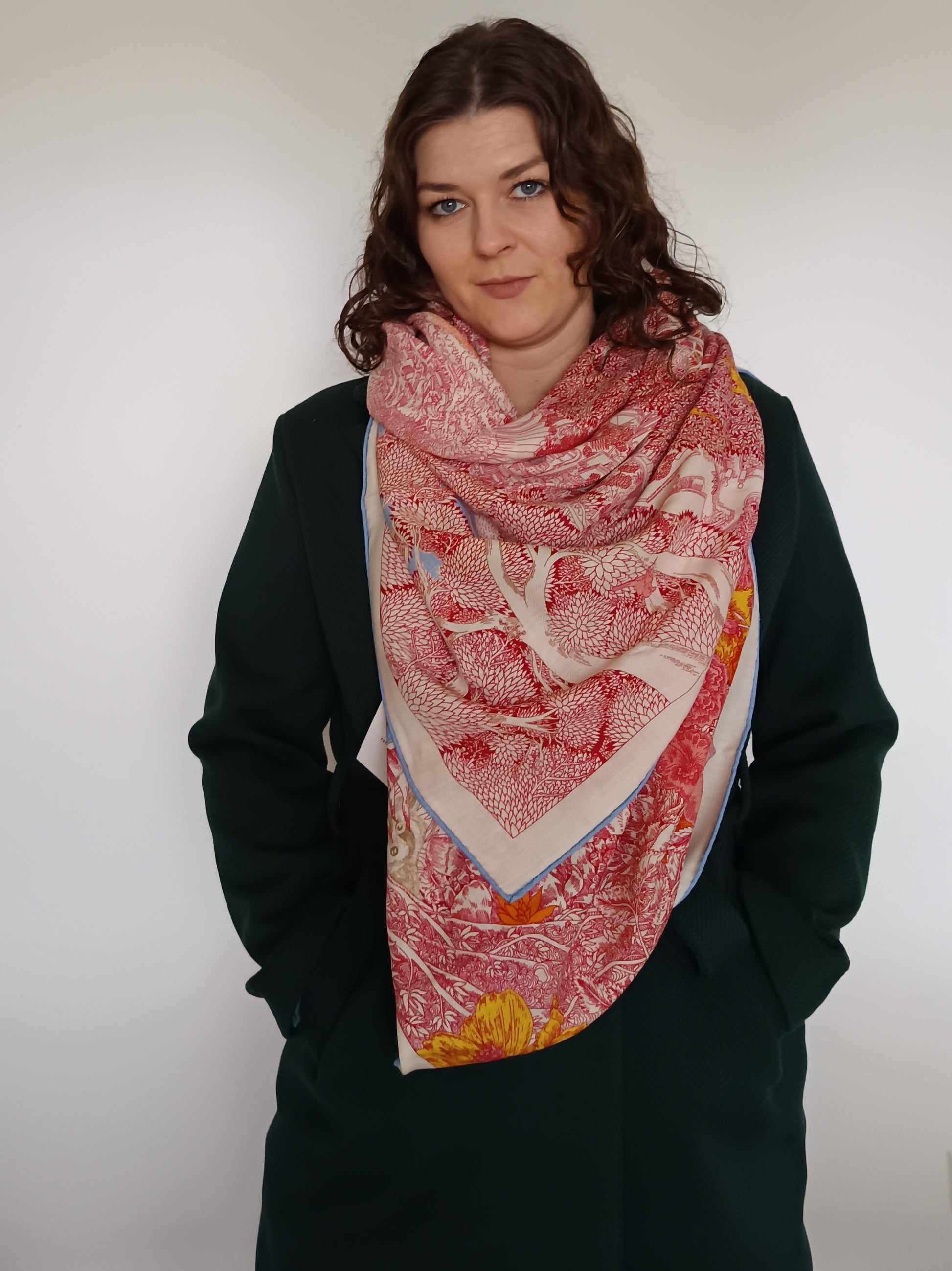 Zanurz się w głębokiej czerwieni tego wyjątkowego szala, który łączy w sobie lekkość jedwabiu i otulające ciepło wełny. Jego zwiewna, delikatna tkanina subtelnie muska skórę, dodając każdej stylizacji odrobiny luksusu i wyjątkowości. Duży format daje nieskończone możliwości noszenia – możesz zarzucić go na ramiona, owinąć wokół szyi lub finezyjnie upiąć.