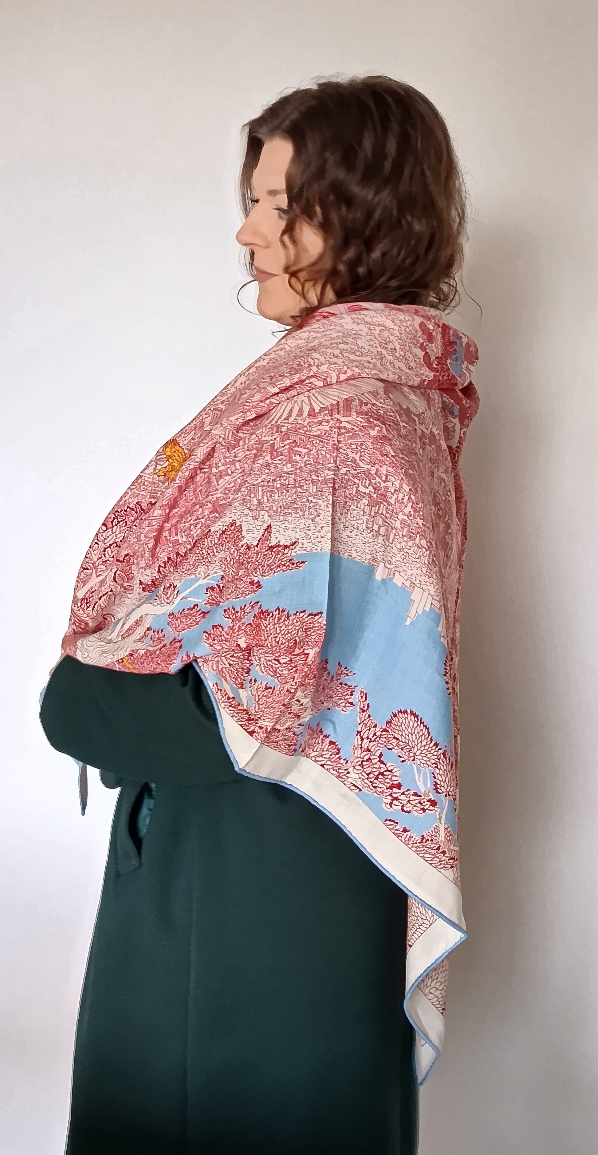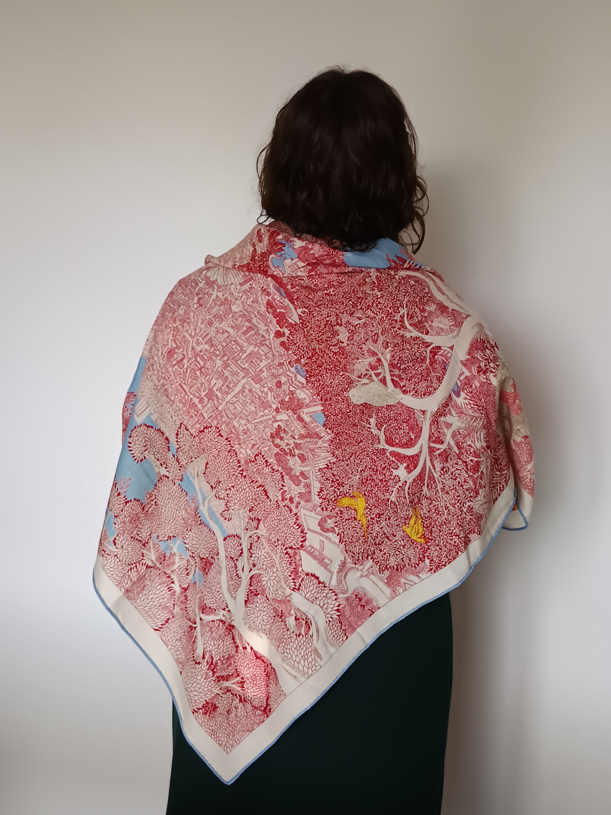 Wzór przenosi Cię do magicznego miejsca – na granicy natury i miasta. Wśród wijących się roślin i ukrytych zwierząt majaczy odległa architektura, jakby wyjęta z bajki. Dominująca czerwień otula jak ciepło zachodzącego słońca, przełamana subtelnymi, niebieskimi akcentami, które dodają głębi i tajemniczości. Całość wieńczy ręcznie rolowana, niebieska otoczka – wyrafinowany detal, który podkreśla rzemieślniczą precyzję wykonania.