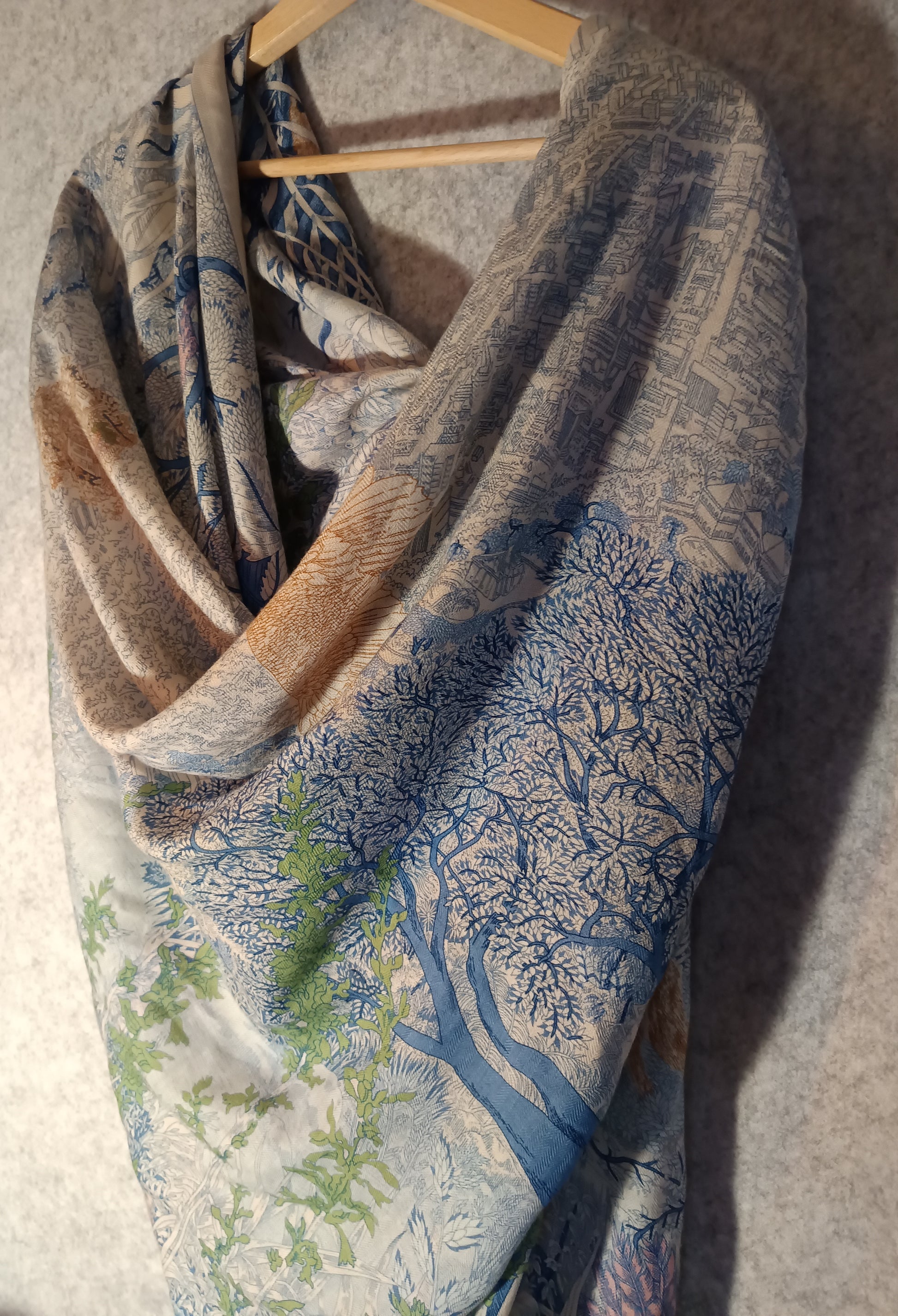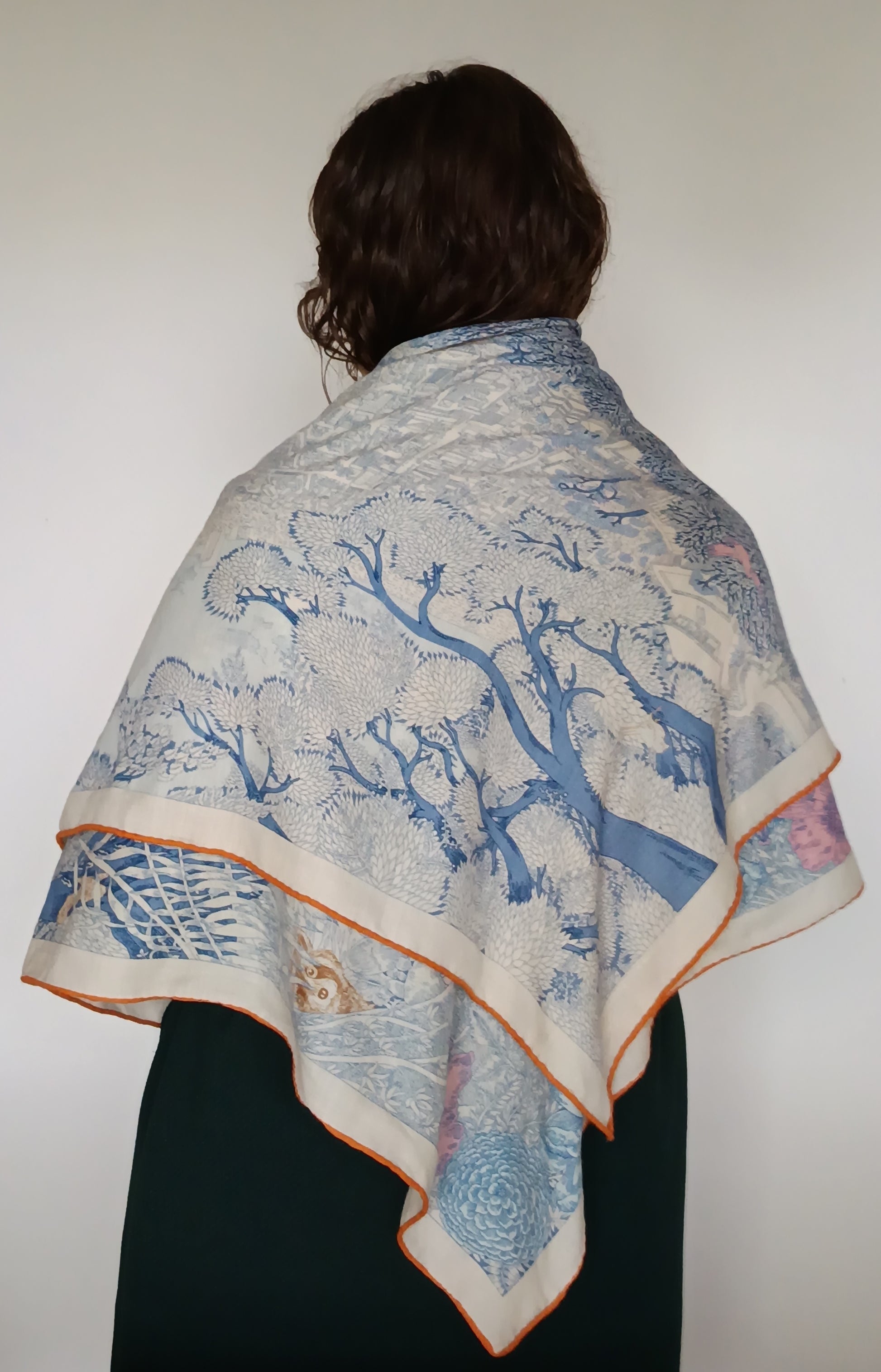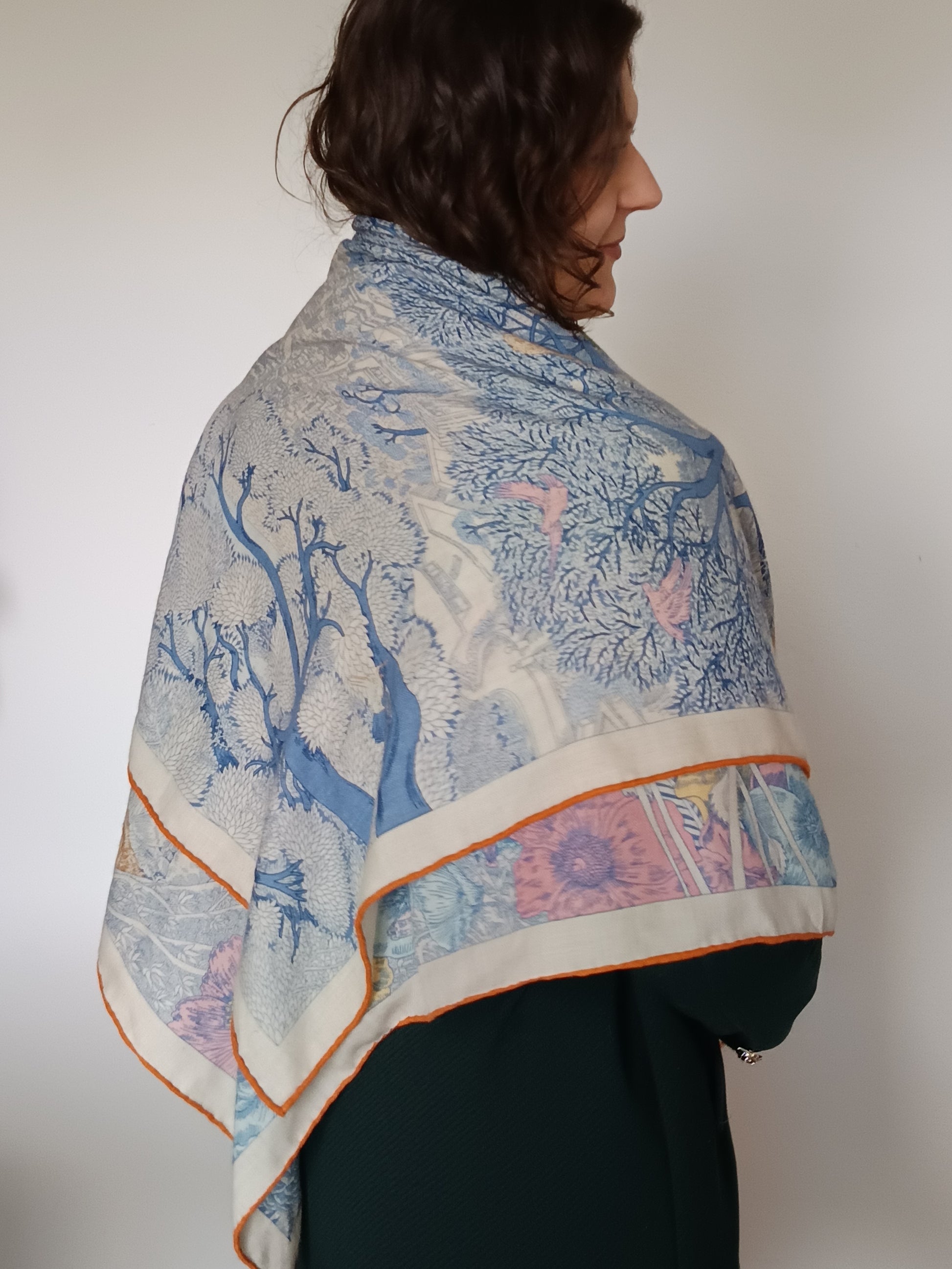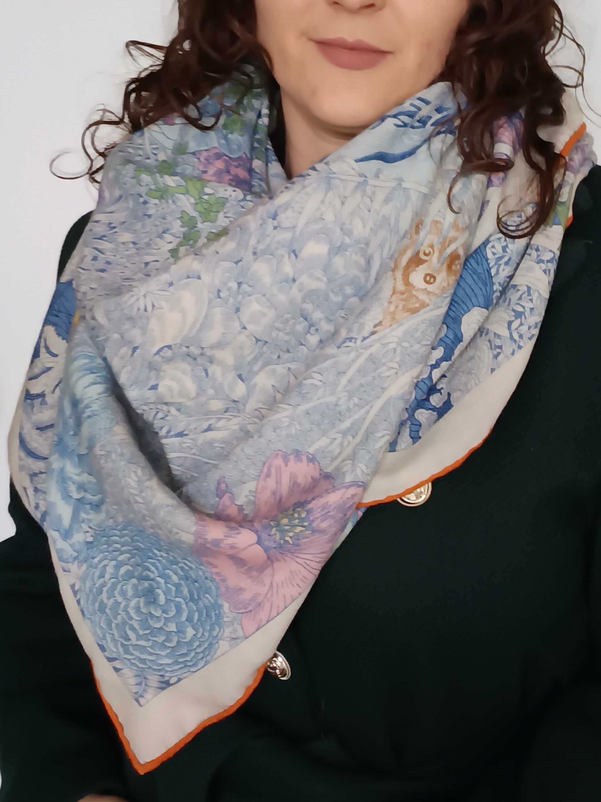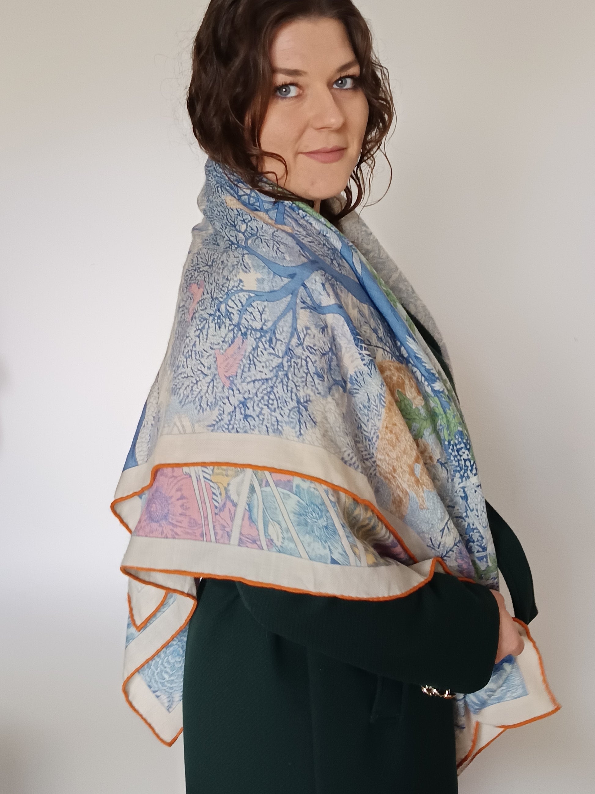 Ten wyjątkowy szal to coś więcej niż dodatek – to opowieść utkane z miękkiej, zwiewnej mieszanki wełny i jedwabiu. Delikatnie otula skórę, dając poczucie lekkości i luksusu, a jego duży rozmiar pozwala nosić go na wiele sposobów – nonszalancko zarzucony na ramiona, subtelnie opleciony wokół szyi lub elegancko przewiązany.